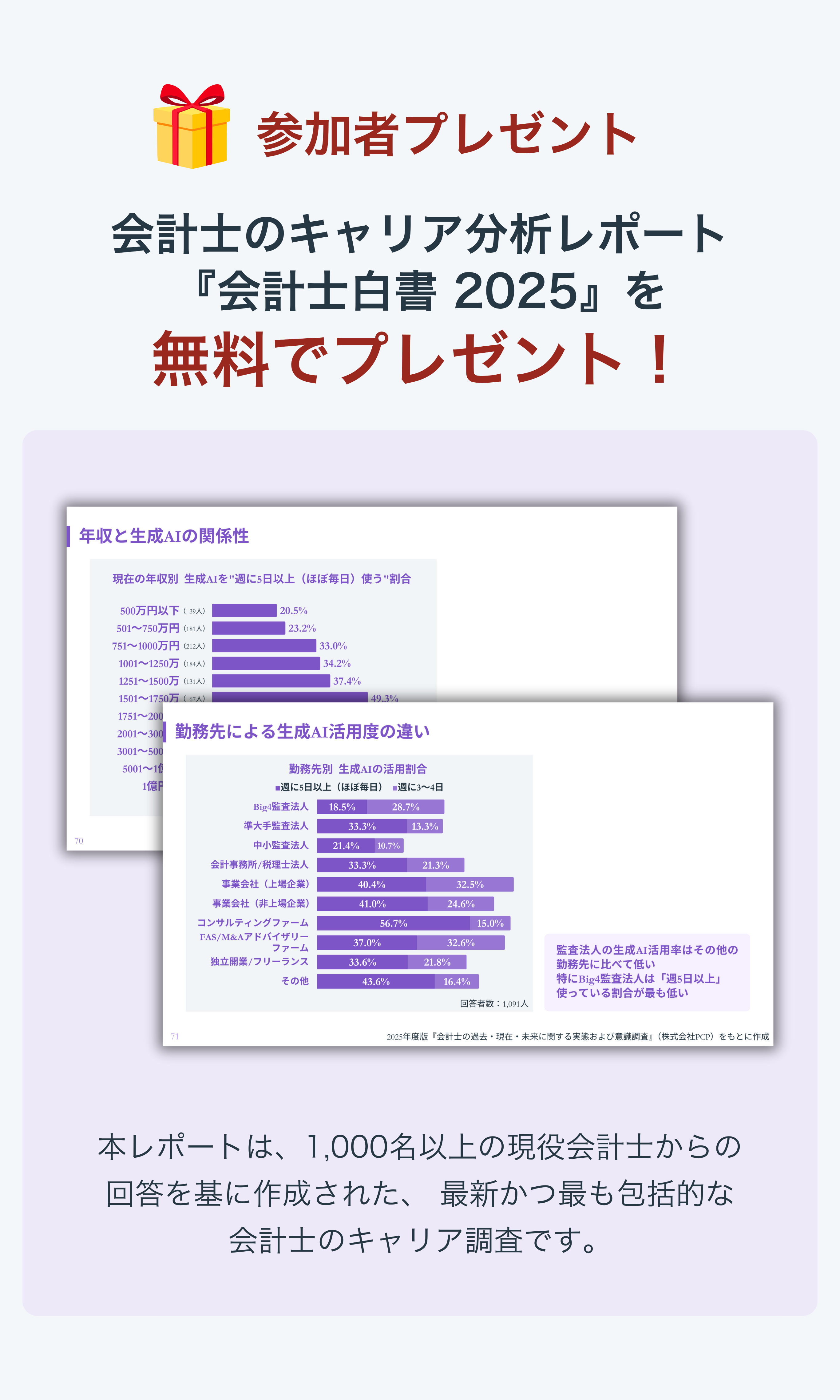 現役会計士1,000人以上を対象に実施したアンケート結果をもとにした【「AI活用度」と「AIに仕事を奪われる脅威」の関係性】がわかる1分クイズです。ぜひ挑戦してみてください。