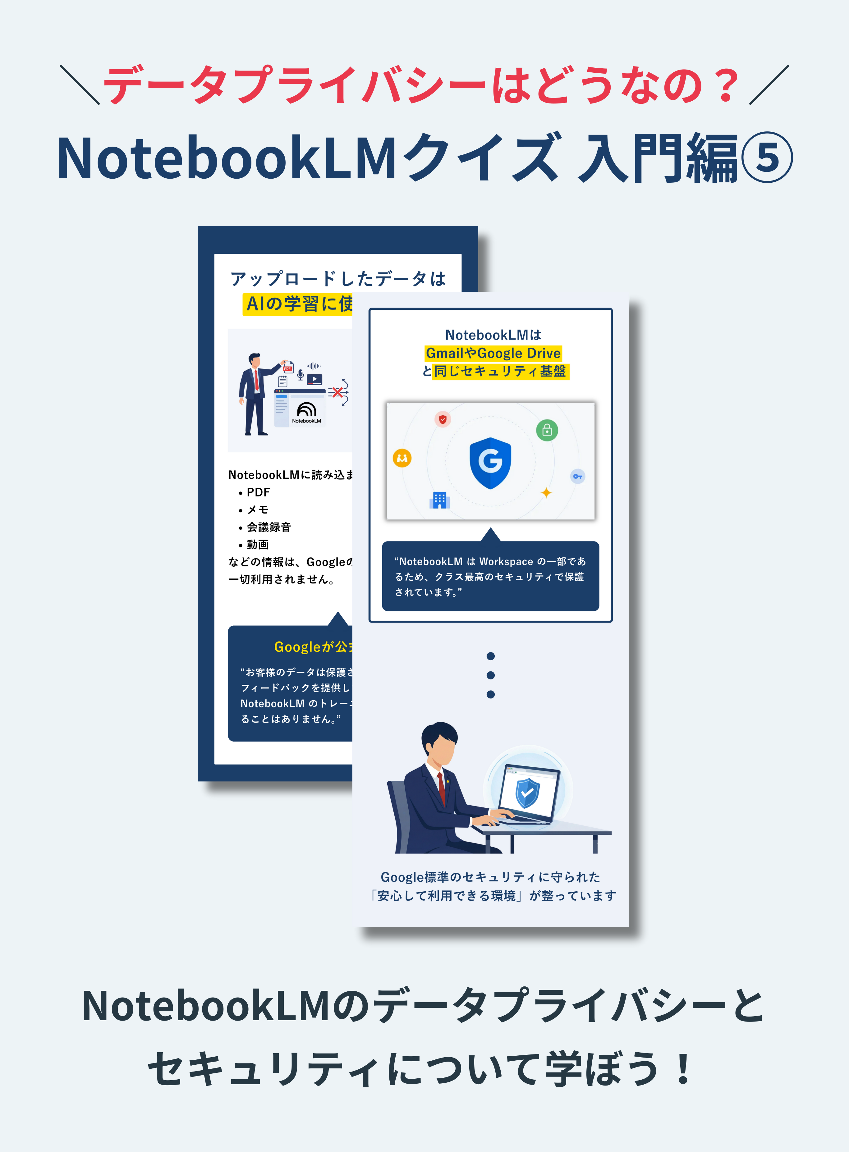 仕事でNotebookLMを使う上で気になる「データプライバシー」についてをクイズ形式で学べます(所要時間:1分)